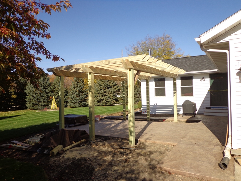 Underside of backyard pergola. Close spacing of lumber provides relief from afternoon sun.
