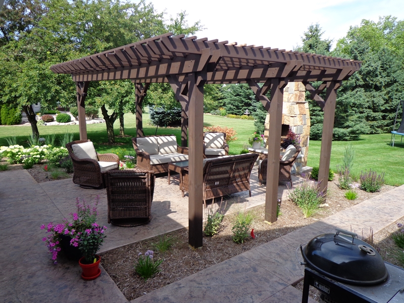 Custom trellis work stained to match pergola. Little Lime Hydrangea planted in front of trellis.