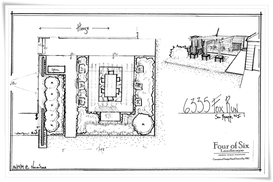 Conceptual Design of proposed patio area and pergola. The original design had a step planned from the main walk down to the sitting area. Due to furniture requirements, the two elevations were simplified to one.