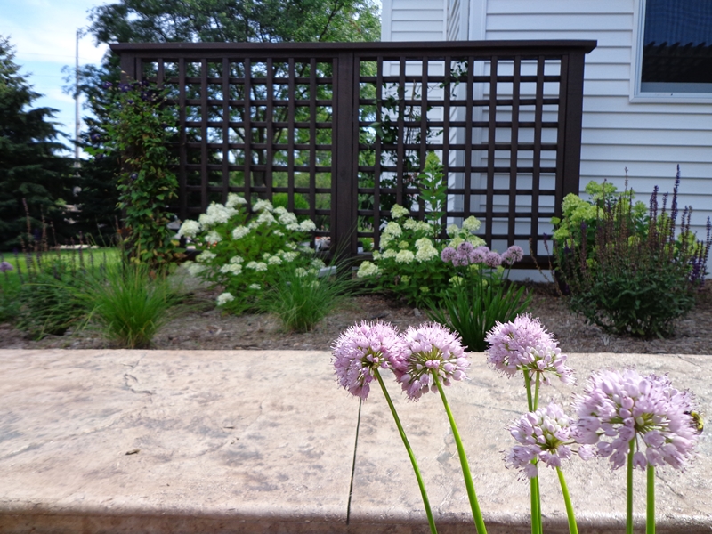 Textures and color throughout the summer help soften the stamped concrete walk.