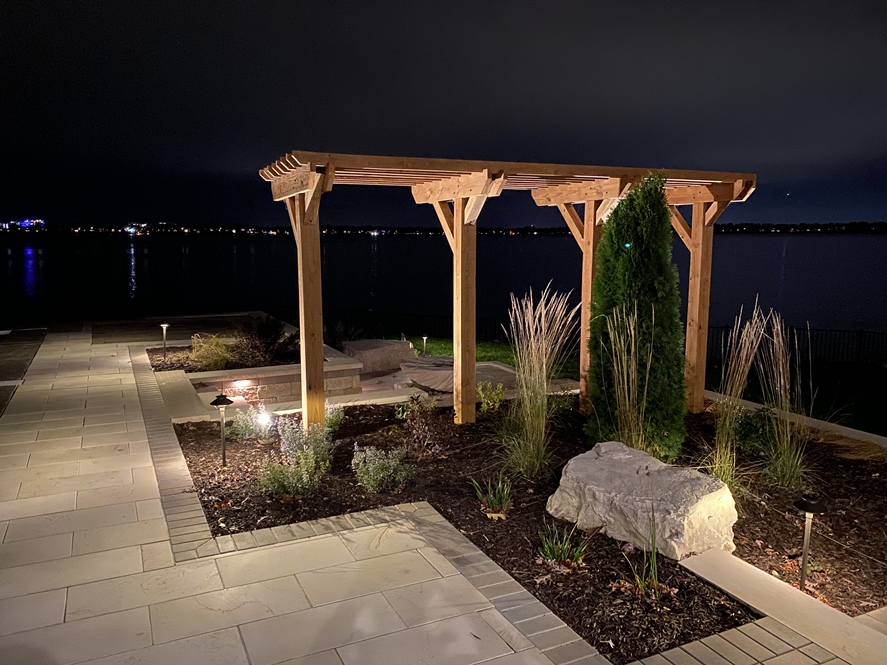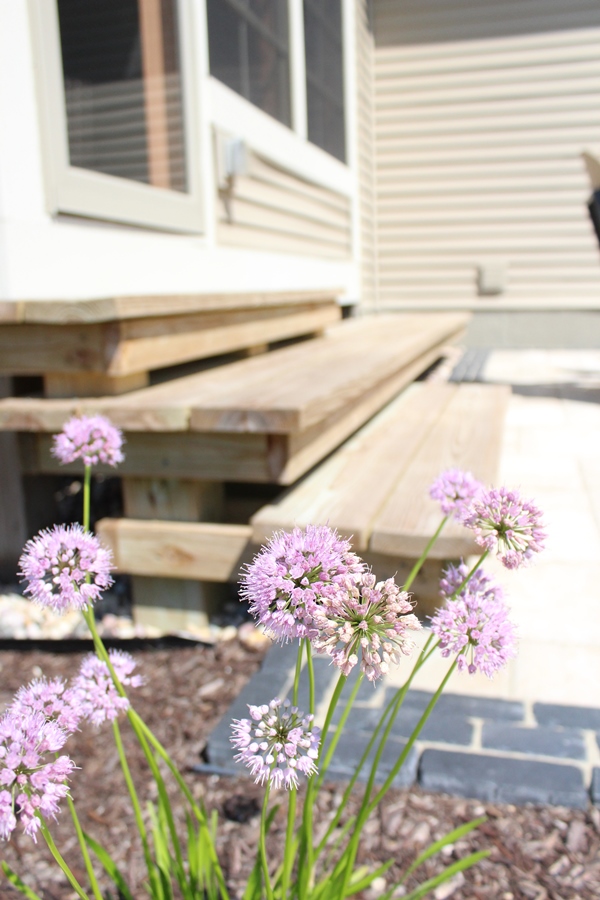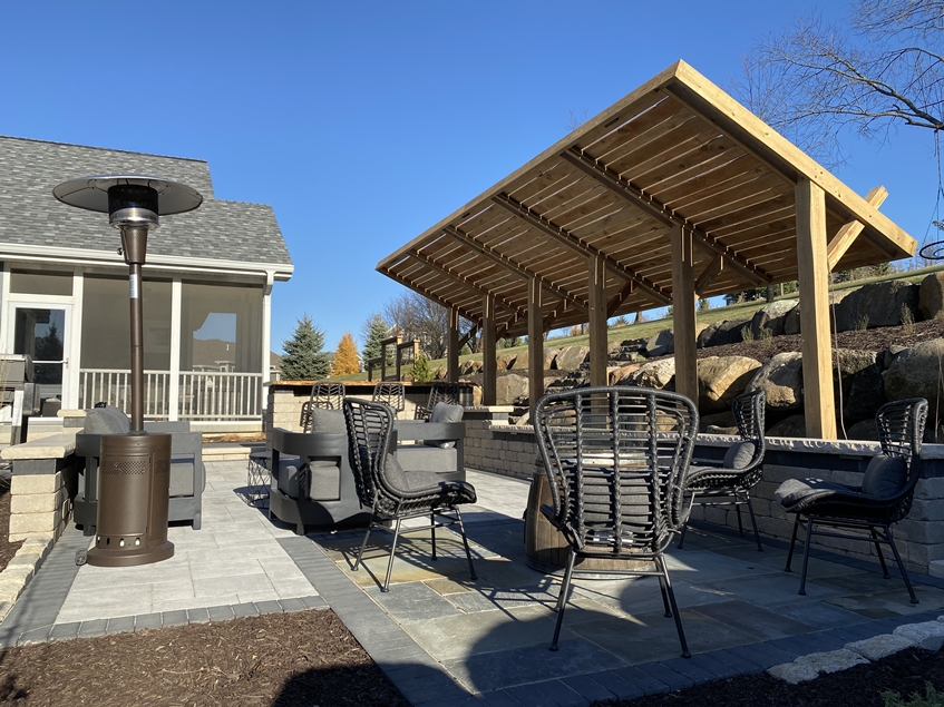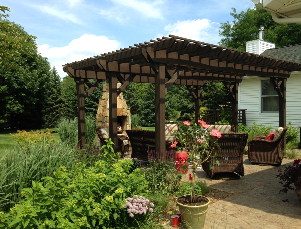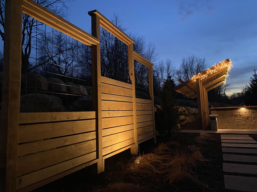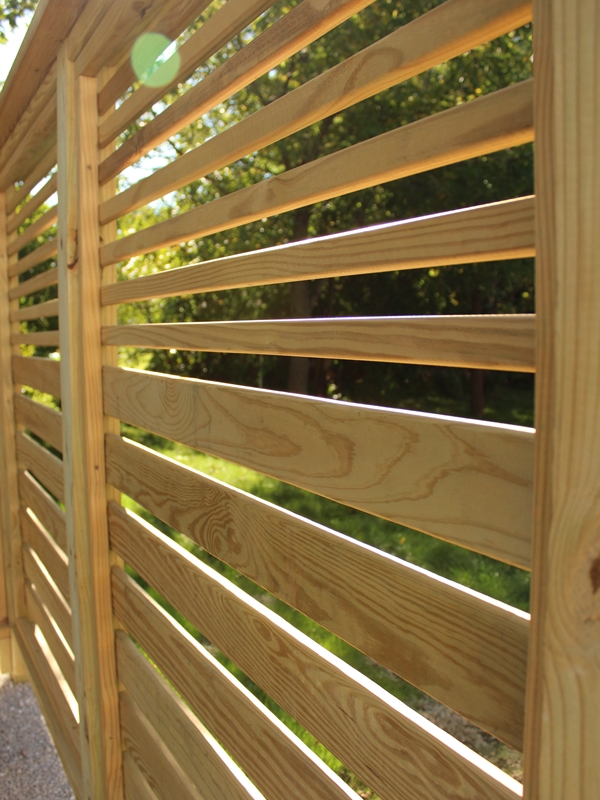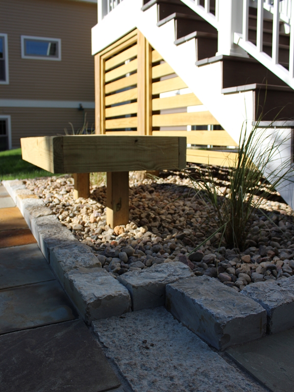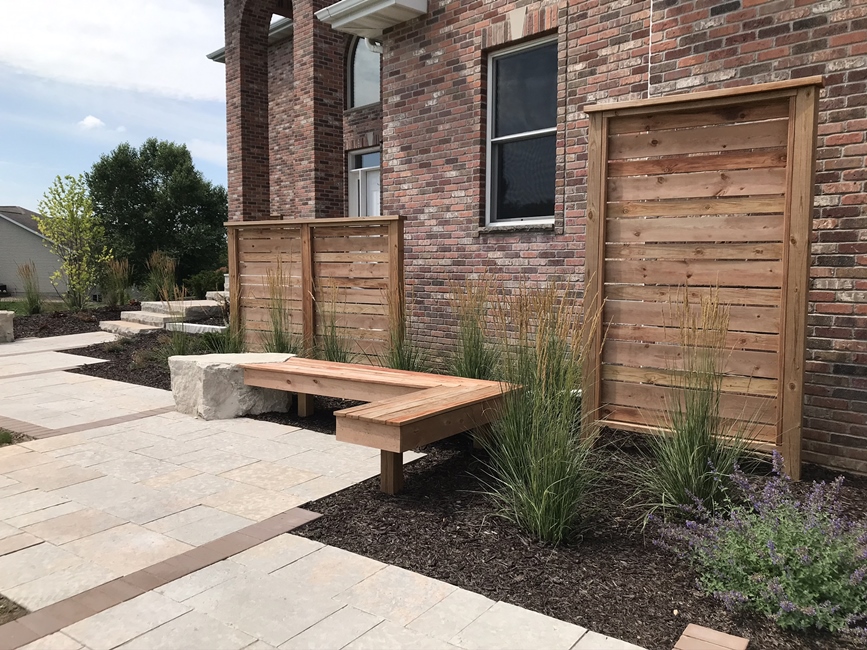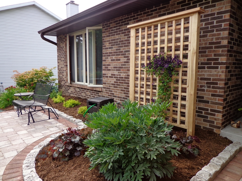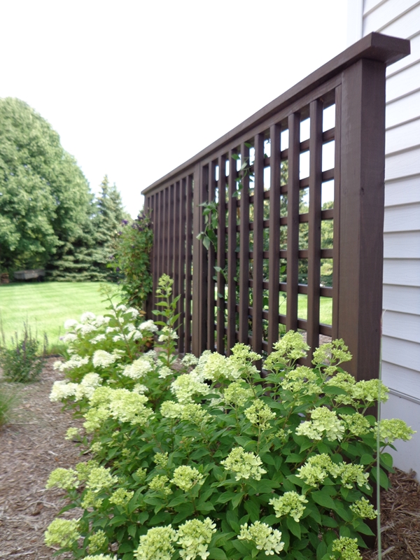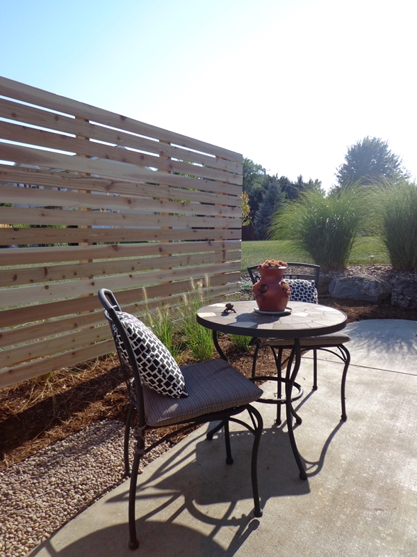 Linear trellis installed adjacent to backyard patio space. Trellis has closely placed boards to provide additional screening. Ornamental grasses will soften carpentry as they mature.