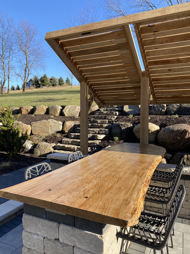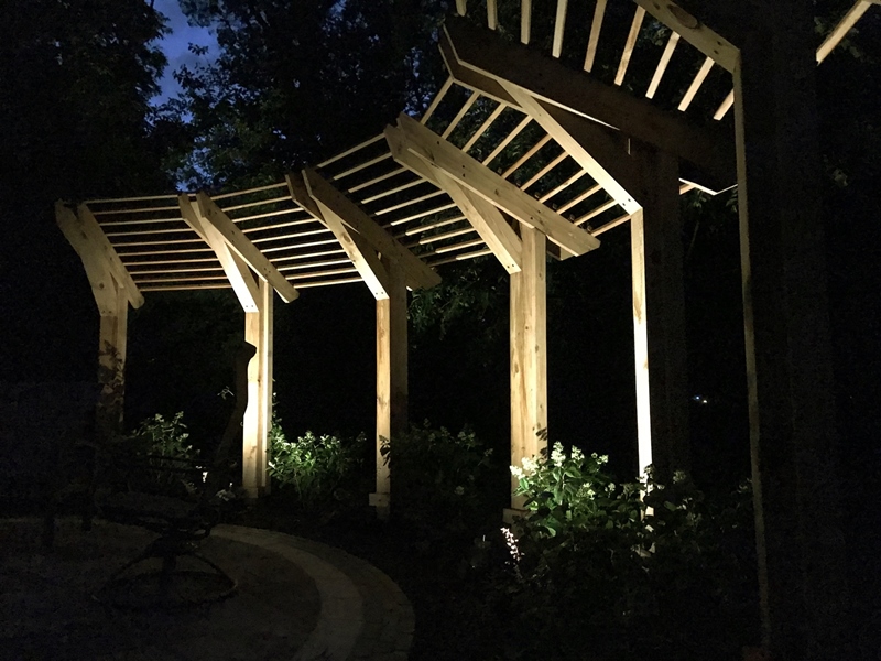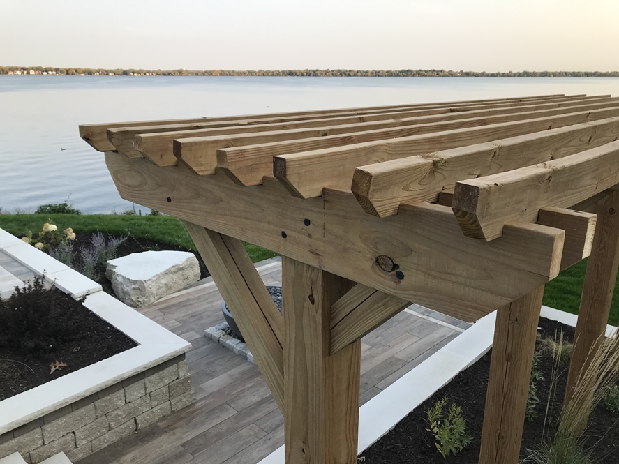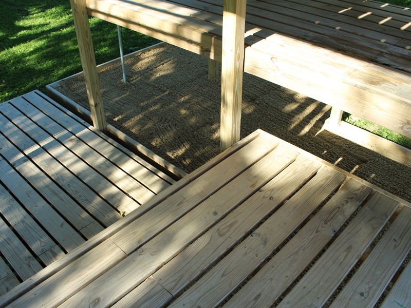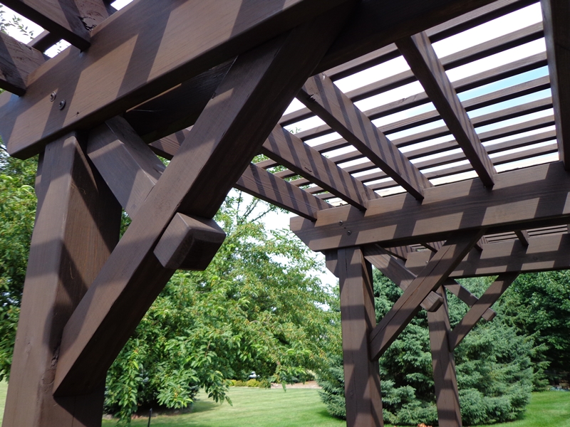 Underside of backyard pergola. Close spacing of lumber provides relief from afternoon sun.
