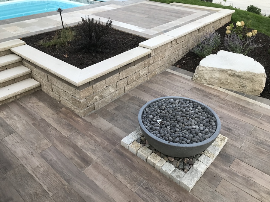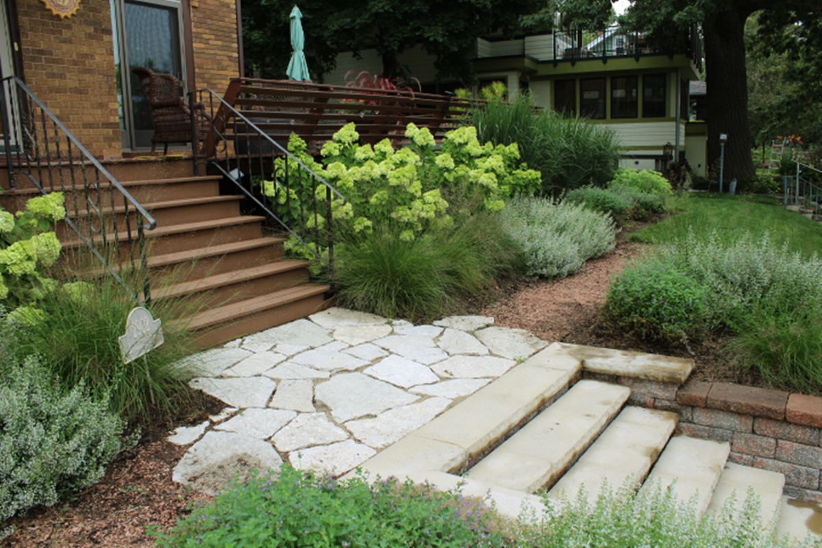 We used Limestone Cobbles to retain existing stone mulch. Limestone wall stone was installed as a paver to match the step.